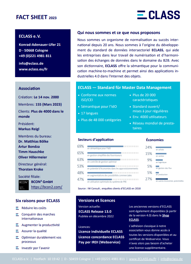 Dans cette brochure, nous répondons à la question "Qu'est-ce qu'ECLASS?" et proposons cinq raisons impérieuses pour lesquelles vous devriez utiliser la norme. Nous présentons les différentes applications dans les domaines de l'approvisionnement, de la production, de l'optimisation des processus et du contrôle de gestion et expliquons quels avantages la norme ECLASS apporte à la transformation numérique et à l'industrie 4.0.