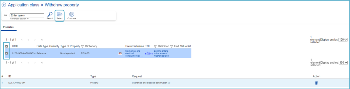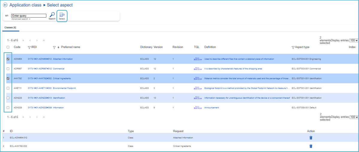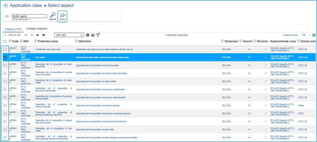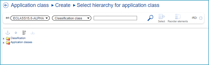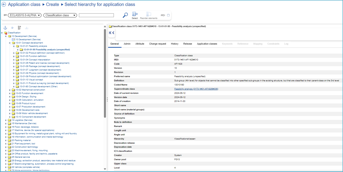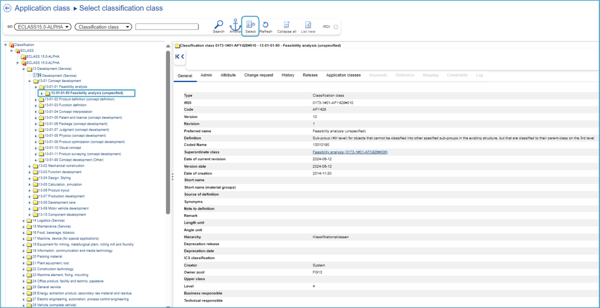After selecting the target Classification Class (4th level) in the hierarchy, on the right a window with all details about this Classification Class will open. At this point, the user can continue the creation process by clicking “Select”.