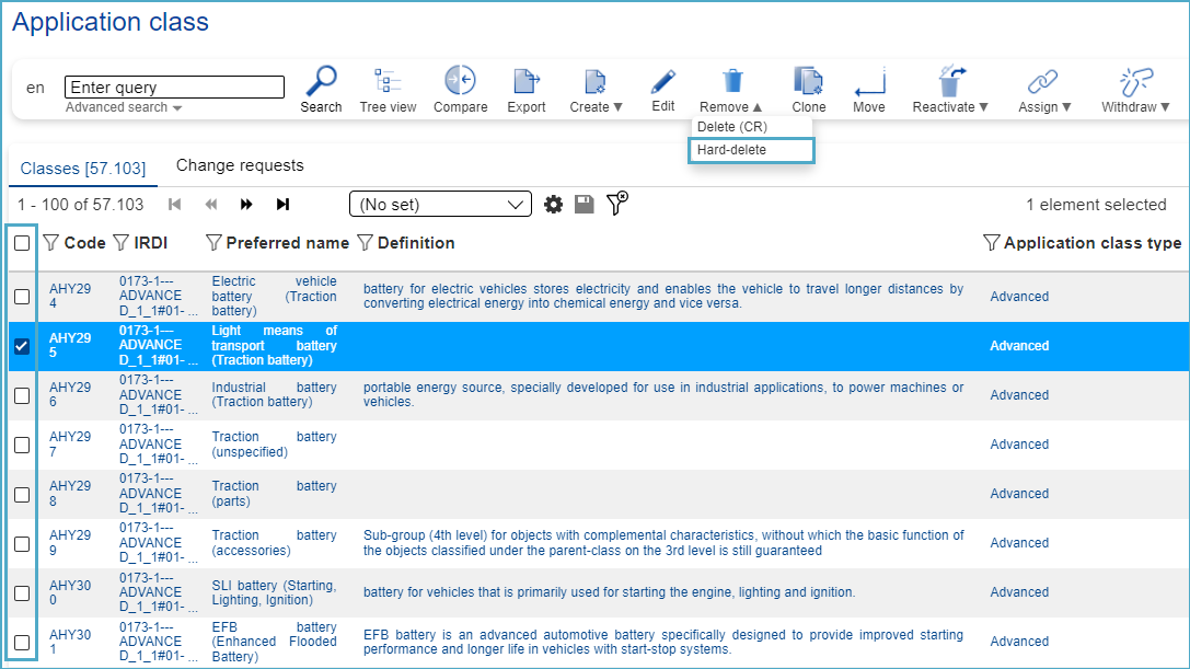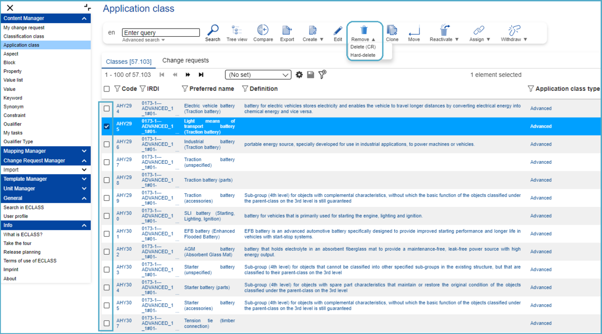 In order to hard-delete an Application Class, the user needs to select first respective element in the corresponding list or tree view. Then he needs to open the drop-down of “Remove” button in toolbar and select option “Hard-delete”.