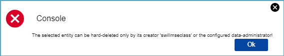 - in case respective User does not have appropriate rights to delete selected Application Class, system displays message that the selected entity can be hard-deleted only by its creator or the configured data-administrator, example: