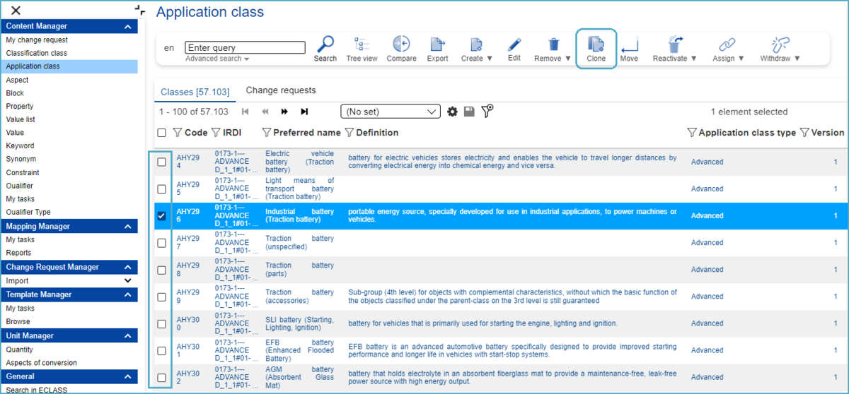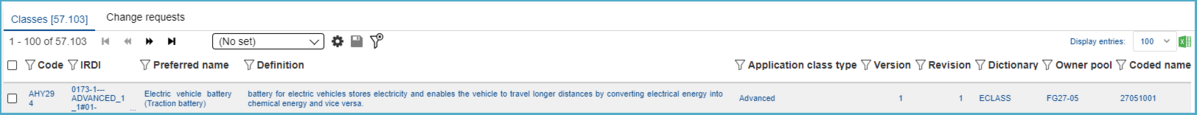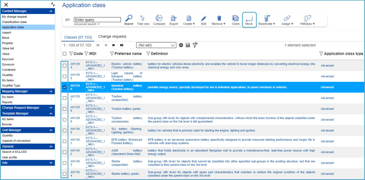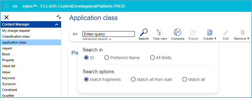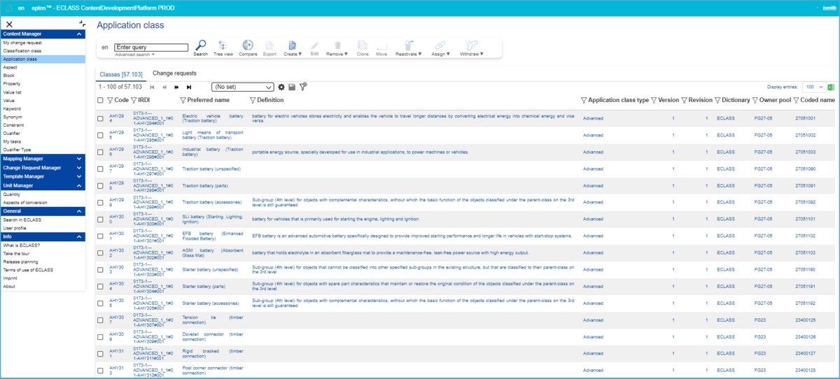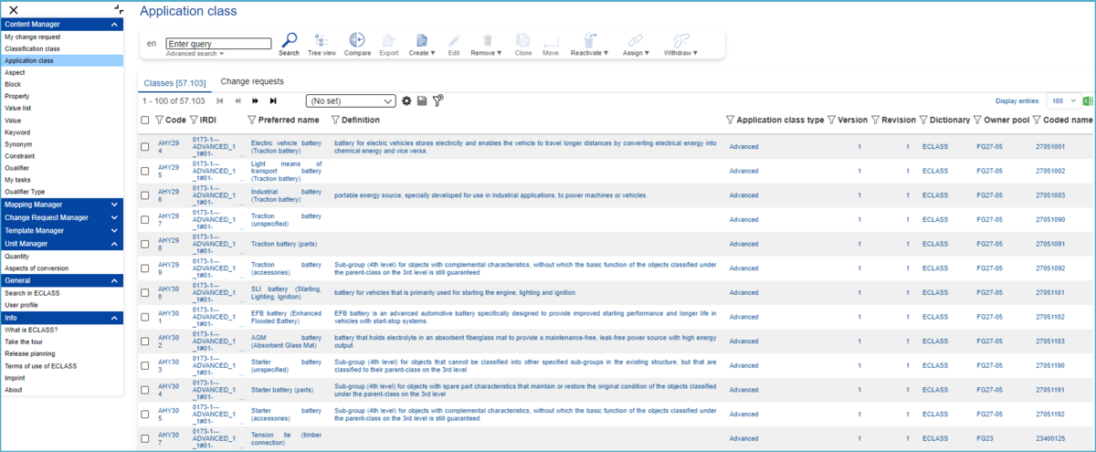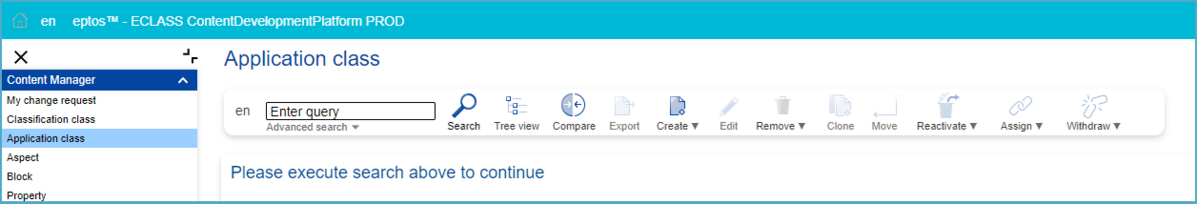 In the search overview, where all available Application Classes as well as Change Requests (CR) are displayed, users have the possibility to change the content language (in which Application Classes will be displayed) and search after specific Application Classes (structure elements or change requests).
