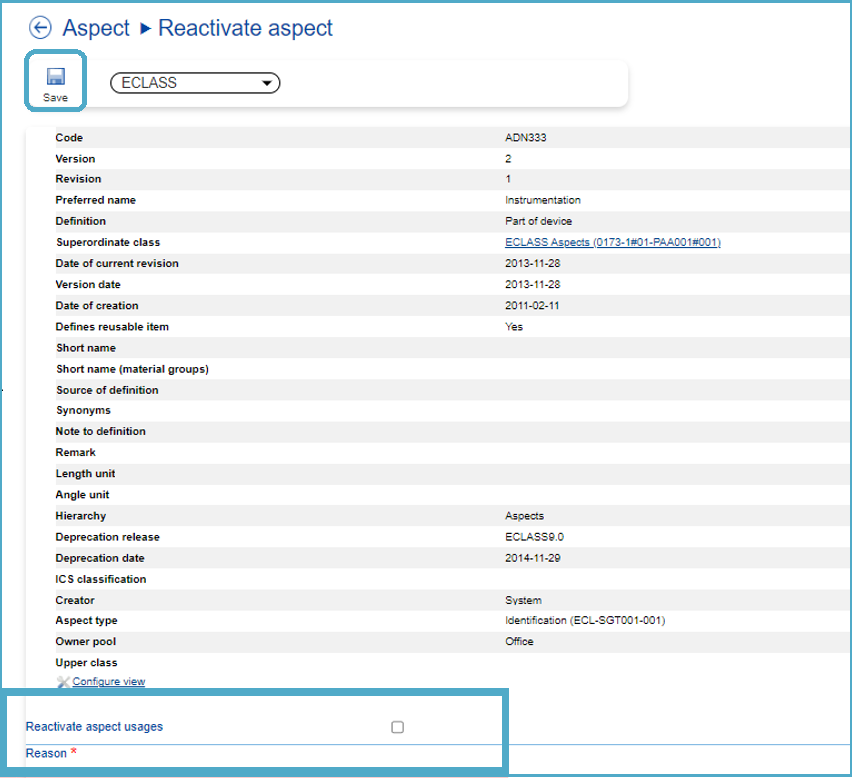 - By ticking the check box “Reactivate aspect usages” system will, besides the reactivation of the Aspect also reactivate its previous assignments, if available.