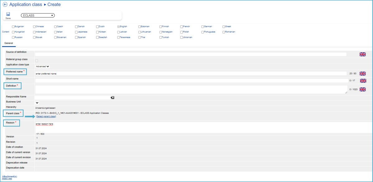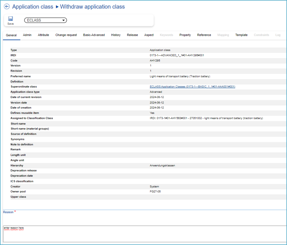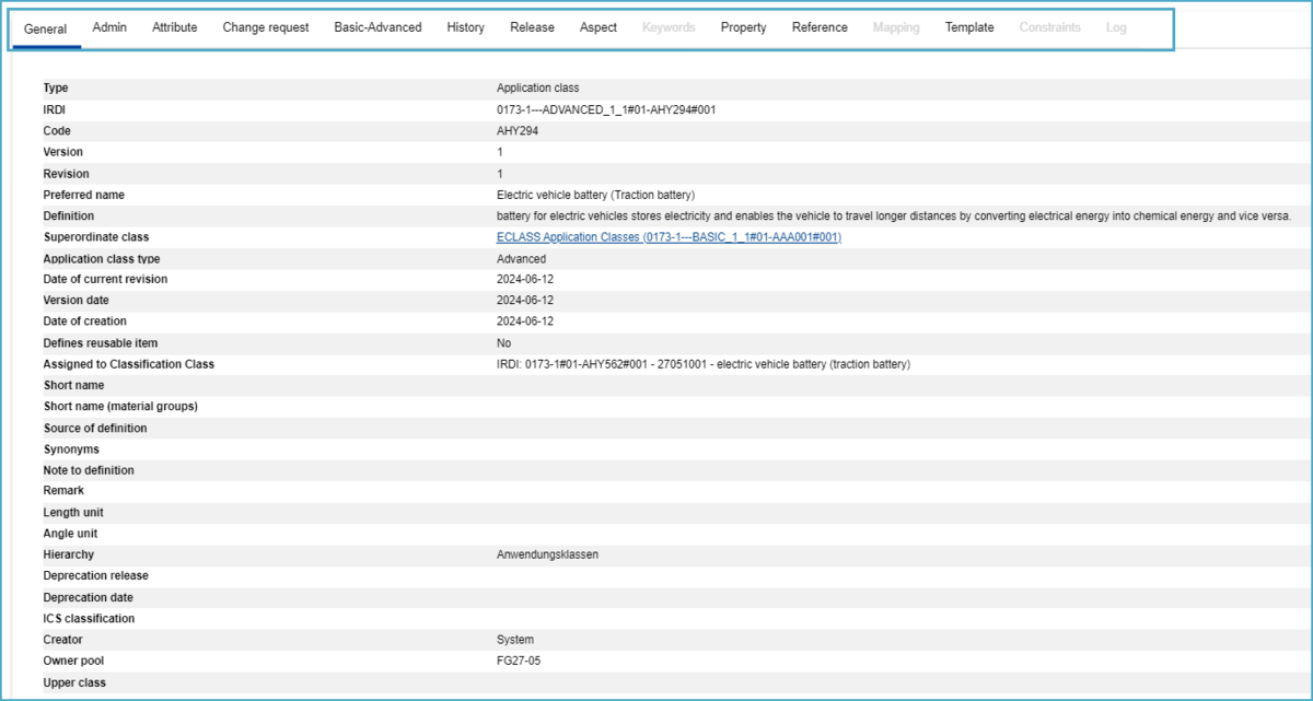 In order to view more details related to an Application Class, users may open the Application Class in view mode by clicking on it (IRDI or preferred name) from the tabular view. The details page of an Application Class is subdivided into different tabs. Tabs which do not contain any information are grayed out.