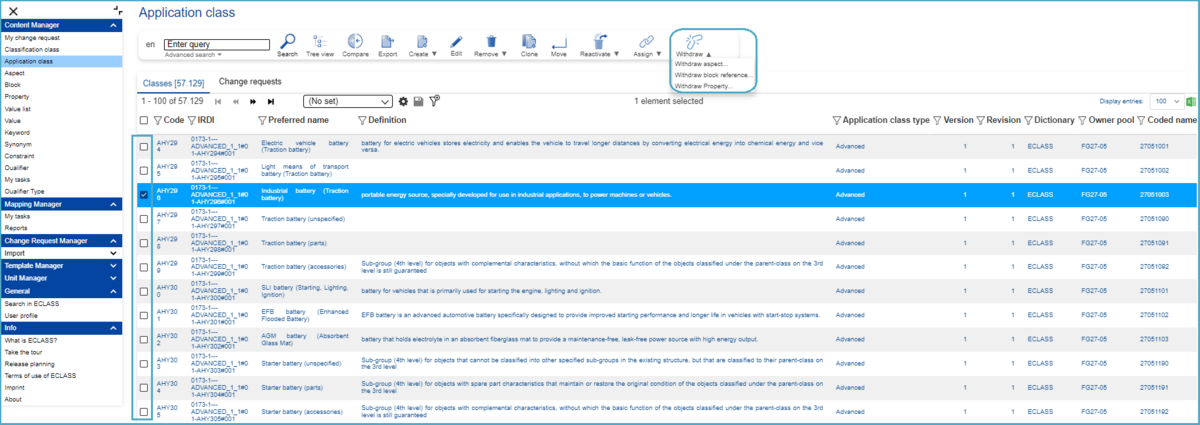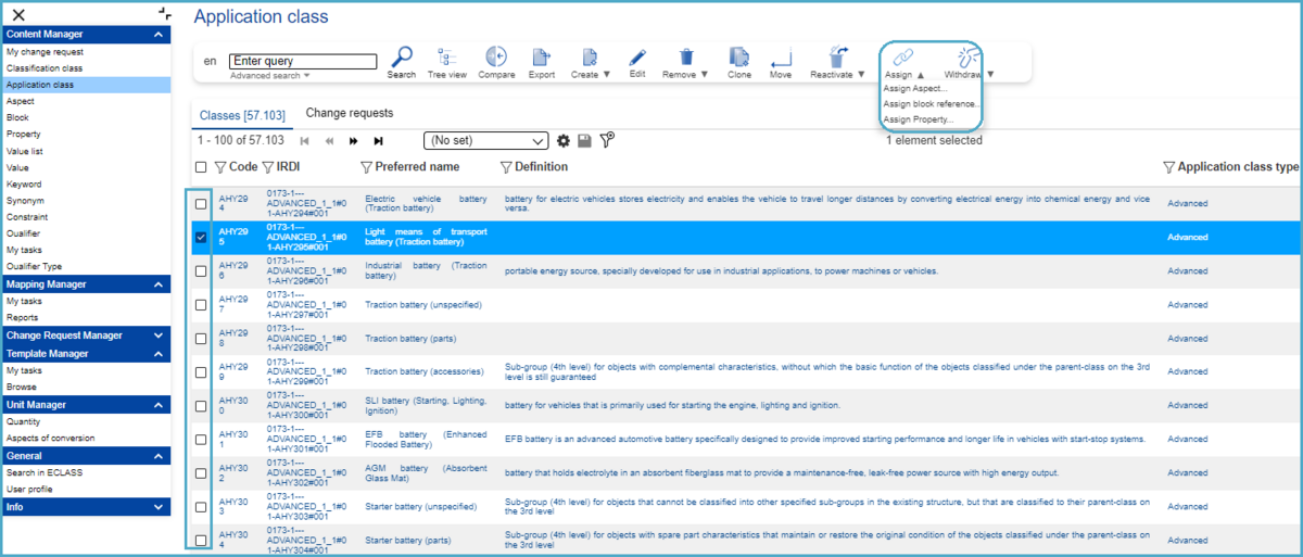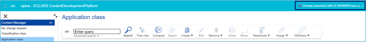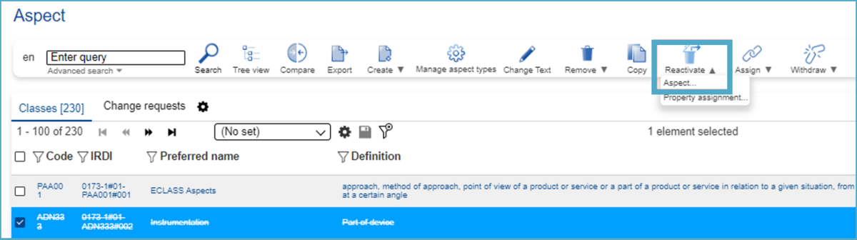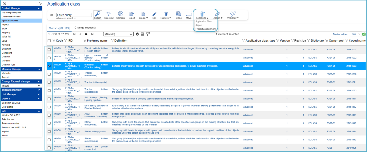 A Property is withdrawn from an Application Class and needs to be reactivated. In order to create a Change Request (CR) to reactivate an existing Property from an Application Class, the user has to proceed as follows: After selecting Application Class under Content Manager, select an Application Class (SE or CR) in the list view. After this hover above the “Reactivate” icon and choose the option “Property Assignment”.