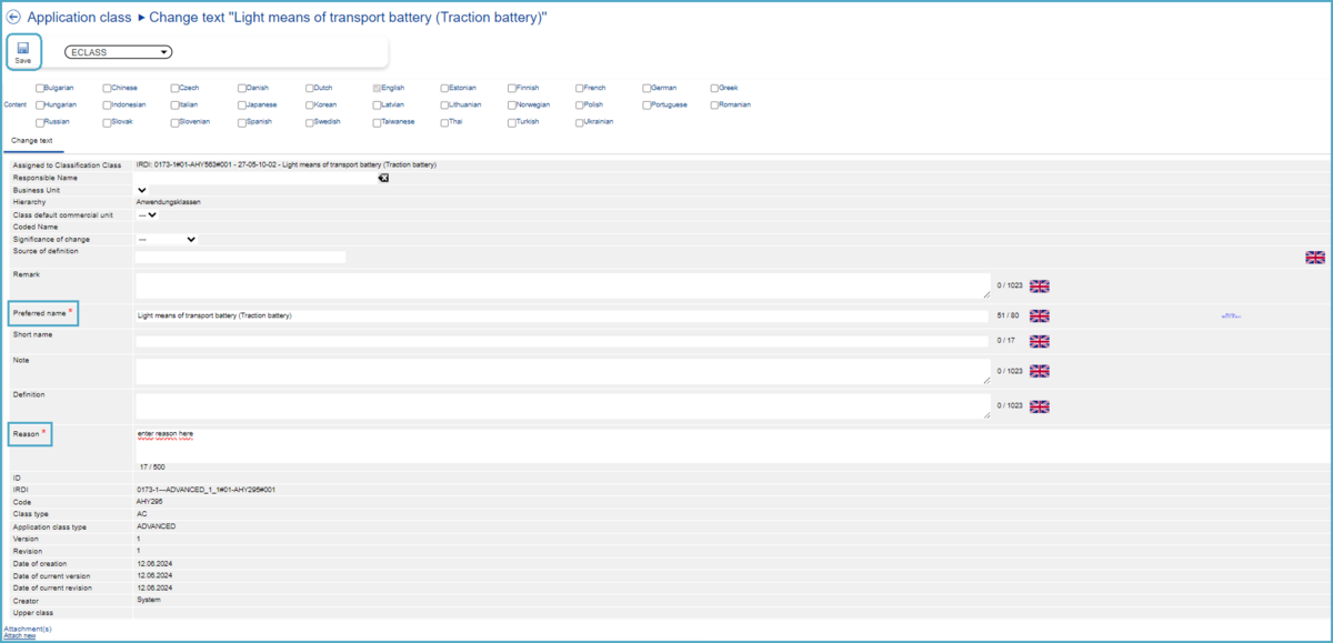 Fill in the fields with the new text as well as the mandatory reason and then press button “Save”.