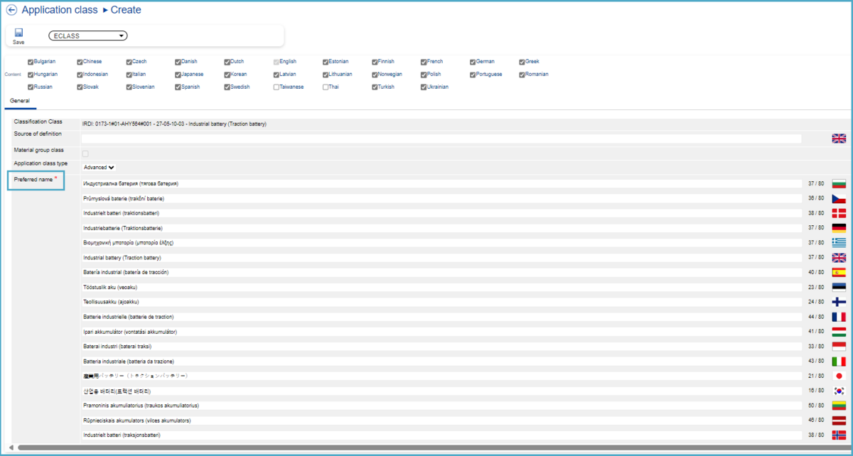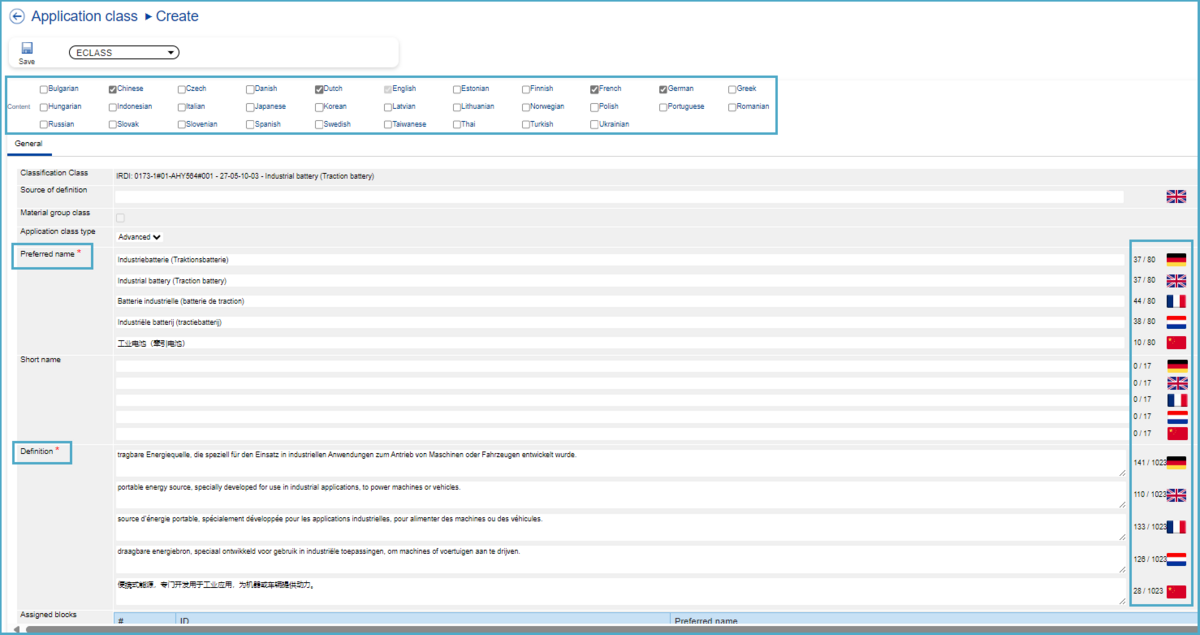 The content languages can be deselected here as desired, which reduces the fields for Preferred Name and Definition for the corresponding languages.