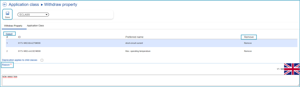 If the user wishes to remove some of the Properties they have previously selected, they can do so by clicking 'Remove' for the relevant Property. Finally, the reason for this type of Change Request must be entered before saving.