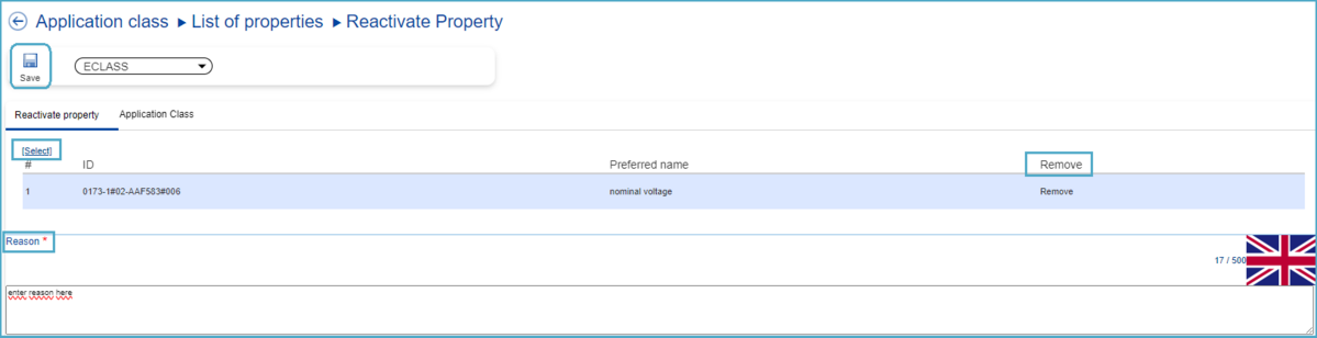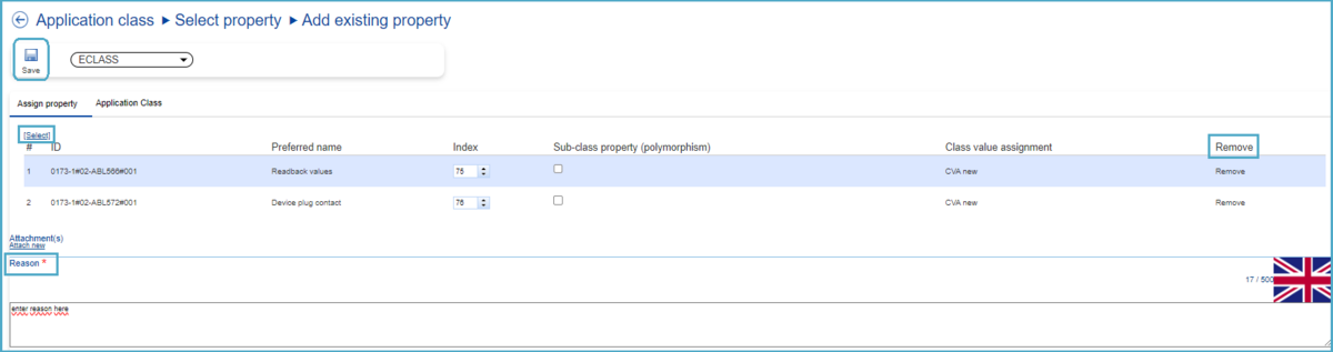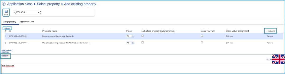 Here, if required, an additional Property can be added using the "[Select]" under "Assign Property". If the user wishes to remove any of the previously selected Properties, they can do so by clicking on the 'Remove' button for the relevant Property. Finally, the reason for this type of change request must be entered before saving.