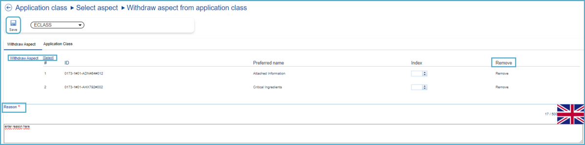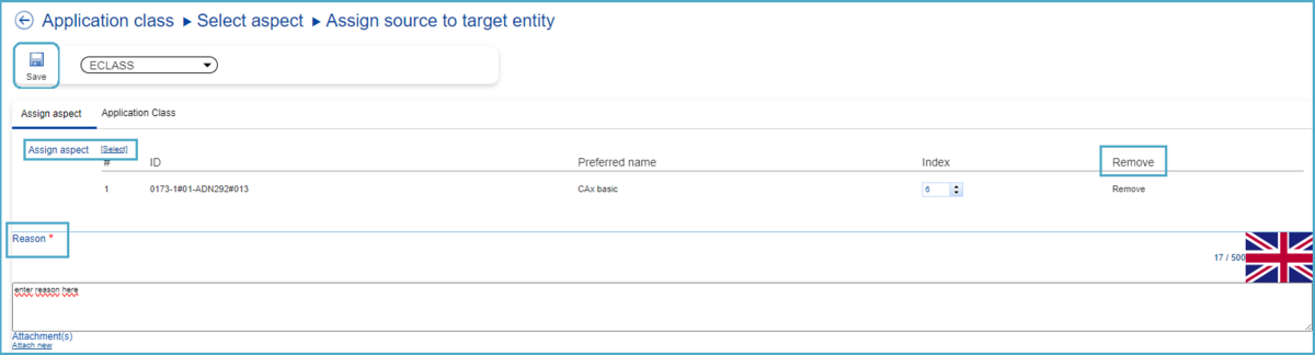 Here an additional Aspect can be added if required using the "[Select]" button next to "Remove Aspect". If the user wishes to remove any of the Aspects previously selected, they can do so by clicking on "Remove" for the relevant Aspect. Finally, the reason for this type of change request must be entered before saving.