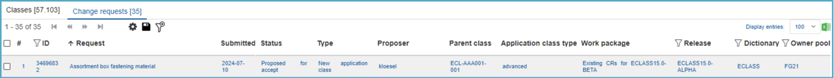 The user can select between the tabs Classes [number of existent Acs] and Change Requests [number of Change Requests].