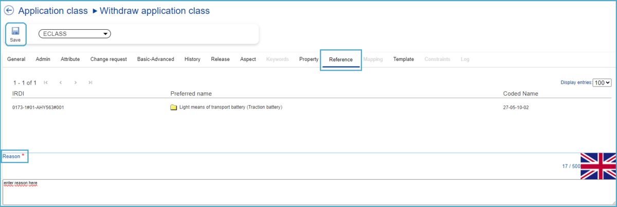Reference | Tab Reference displays in a tabular view information related to the Classification Class(es) in which the selected Application Class is used. |