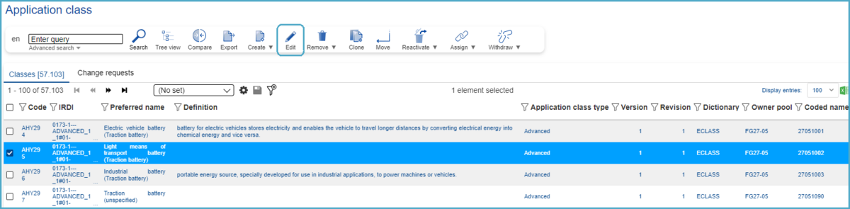 Select an Application Class in the list by clicking it in order to create a CR for changing the textual information (button “Edit”).