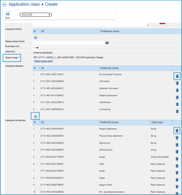 By scrolling further down, additional structural elements can be seen that were assigned to the previously selected Application Class. For the Assigned Aspects and Assigned Properties, users can delete (“Trash” icon) or add (“+” icon) further ones as desired. In this specific case, there were no Assigned Blocks, but new blocks can be added if desired.