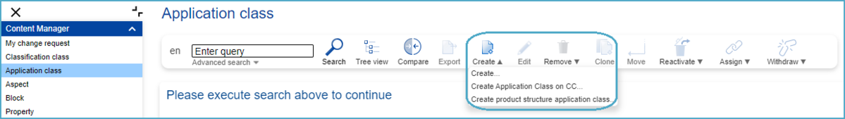 In order to create a Change Request for a new Application Class (AC), the user has to hover above the “Create” button and will have three options to choose from: “Create…”, “Create Application Class on CC…” and “Create product structure application class…”