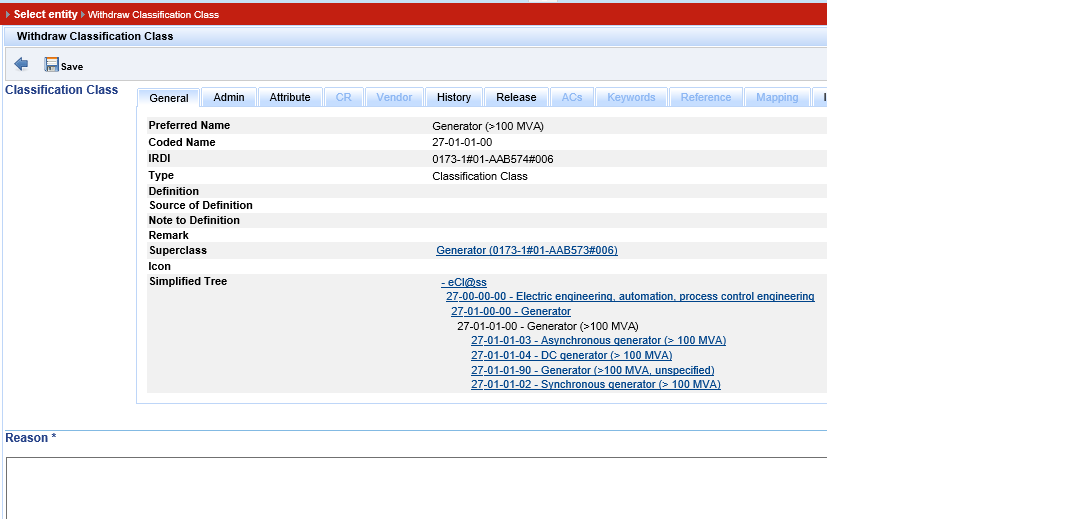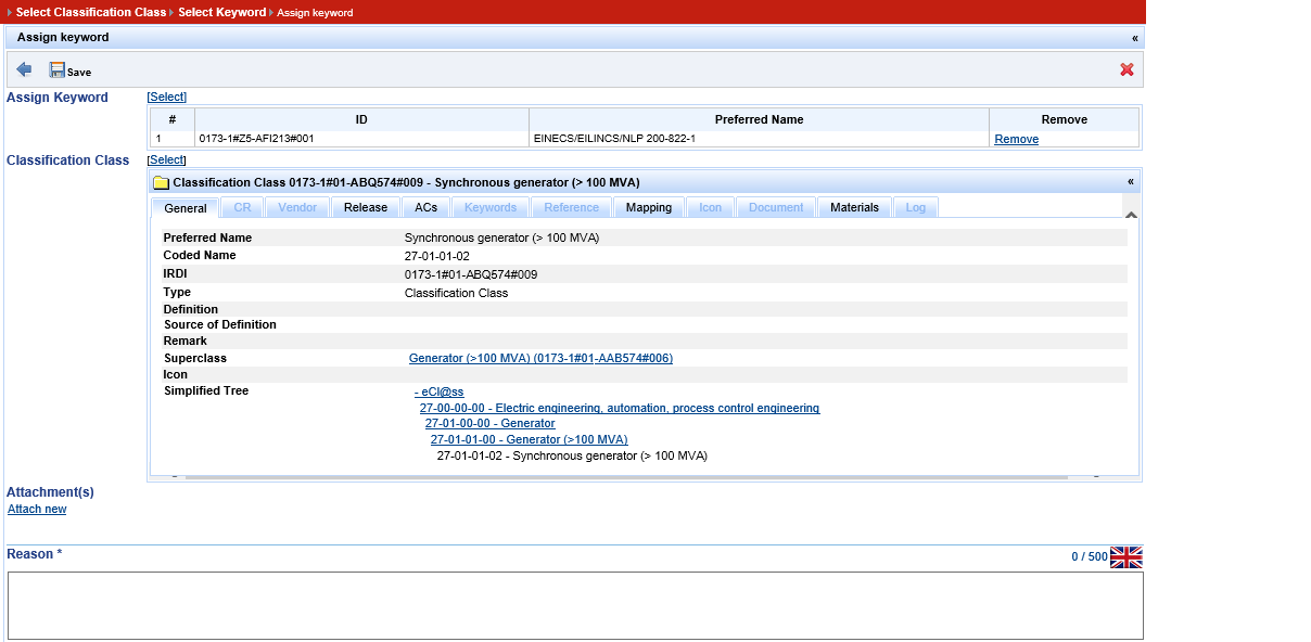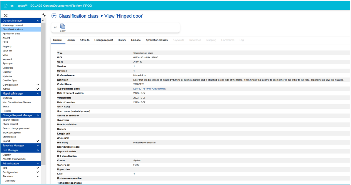 In order to view more details related to a Classification Class, users may open the Classification Class in view mode by clicking on it (IRDI or preferred name) from the tabular view. The details page of a Classification Class is subdivided into different tabs. Tabs which do not contain any information are grayed out.
