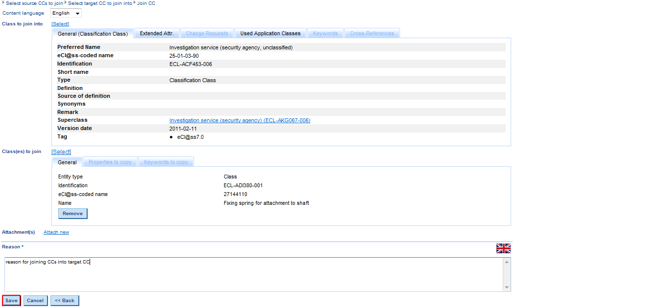 - Example 2: 19010102 shall be joined in existing class 19010101. Only one CR has to be created: JOIN CC 19010102 in 19010101. The CR for DELETE CC 19010102 will be done automatically in the name of the same requestor.
