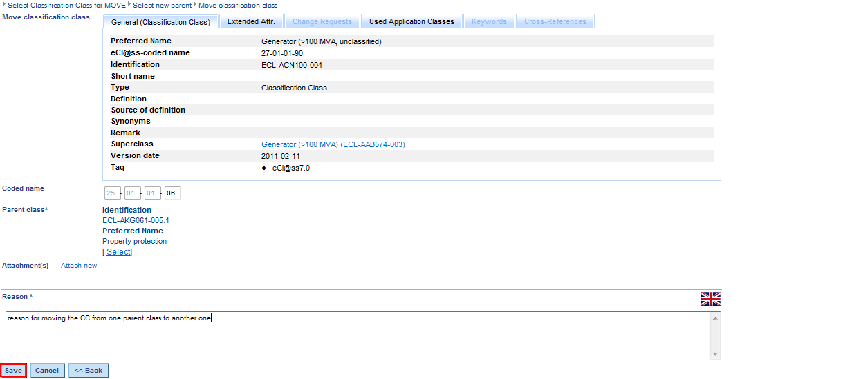8. In the Move Classification Class dialog, enter reason for moving the CC and press button “Save”.