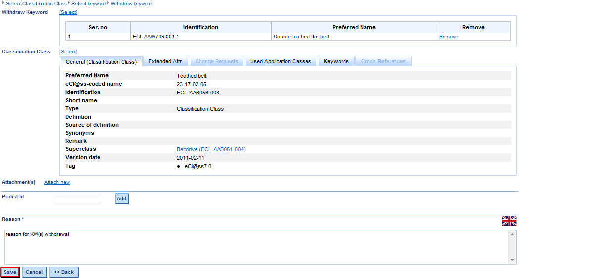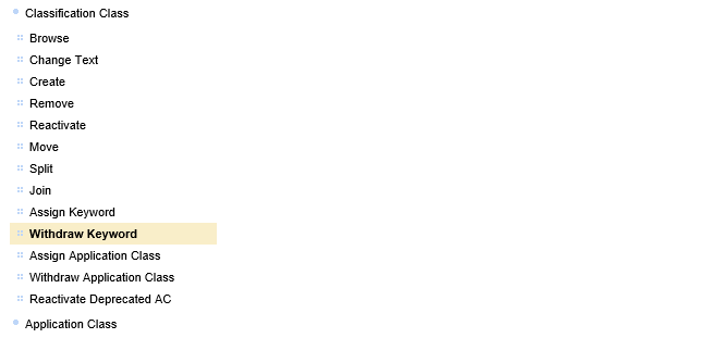 1. Select menu entry Withdraw Keyword under User/Change Request/Classification Class.