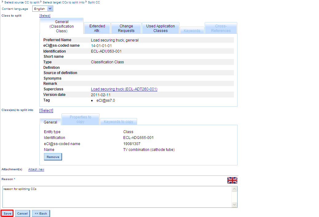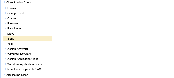 - NOTE: When splitting a CC, all property and keyword assignments of the source class will be copied to the target classes, duplicates with the same identifier being automatically ignored. The requestor can manually change this in a second step or simply by withdrawing properties from the source class.