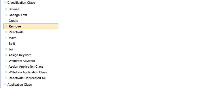 1. Select menu entry Remove Classification Class under User/Change Request/Classification Class.