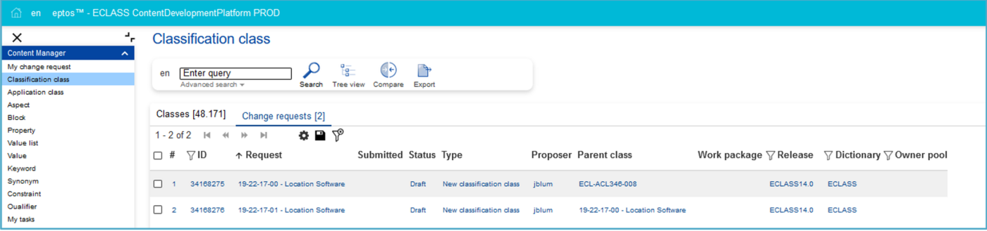 The user can select between the tabs Classes [number of existent CCs] and Change requests [number of Change requests]. Note: Number of Change requests is only displayed after clicking on the tab.