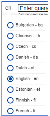 First of all, the user can change the language of the content by navigating the mouse to the button "en" which is left to search field. Various languages can be selected.