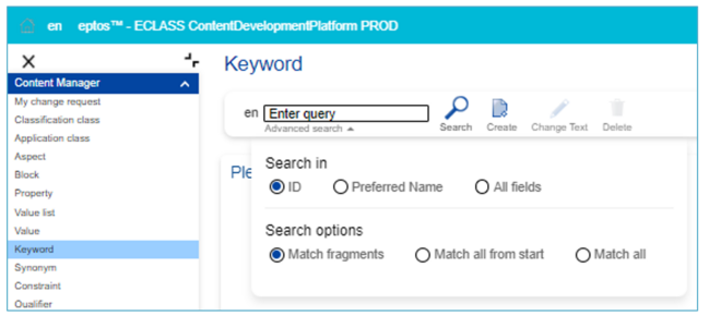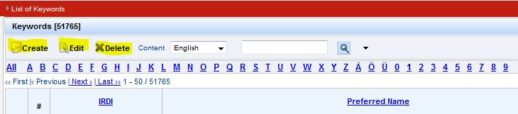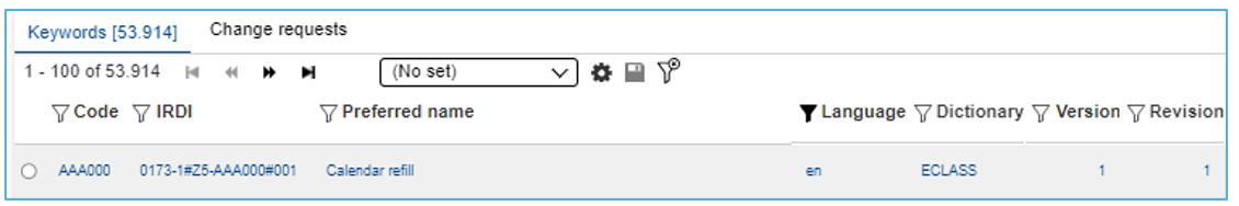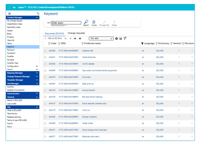 Enhanced search function. The user can browse through all existing keywords (including all change requests for new keywords). The search is always limited to one language at a time. The default is to search for the PreferredName, but can also be changed to include the IRDI.