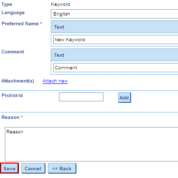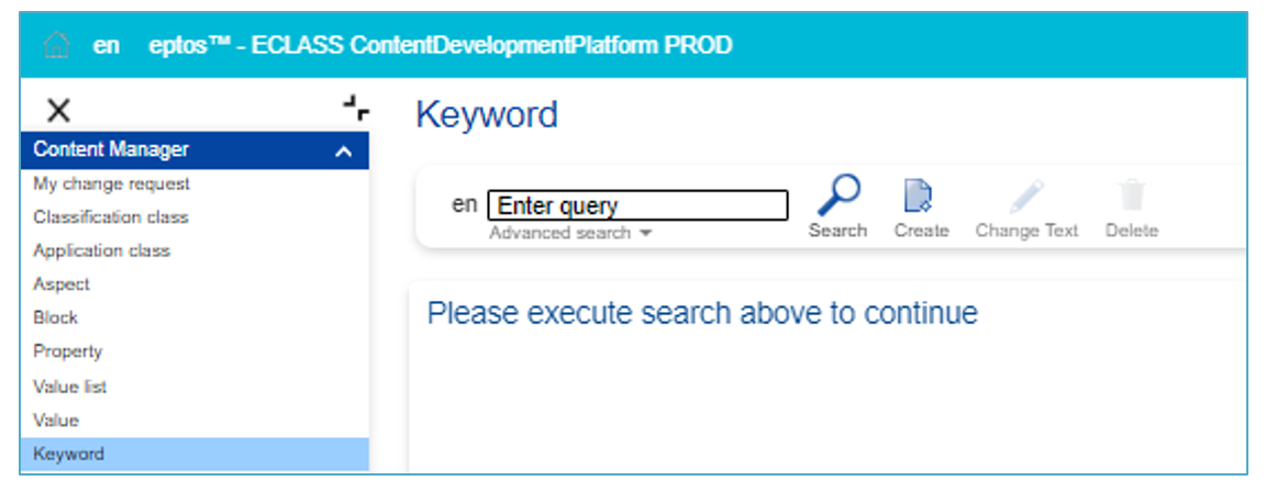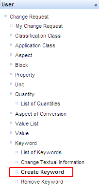 - Select menu entry Create Keyword under User/Change Request/Keyword: