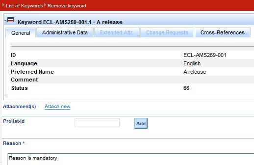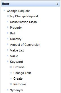 - Select menu entry Remove Keyword under User/Change Request/Keyword.