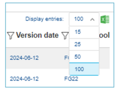 On the far-right side, the option to display up to 100 entries is available. Here the Excel icon allows to directly export in an Excel file the entries that are displayed on the page: