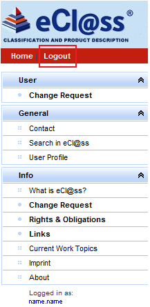 Once the user has finished the session in the ECLASS Service Portal, he will logout by clicking [Logout] on the top of the left-hand panel: