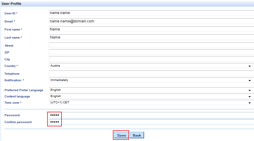 Thus, the user shall provide the User-ID, which becomes the username and serves to login later on. The user-ID usually has the following format: firstname.lastnname, or firstname-lastnname.