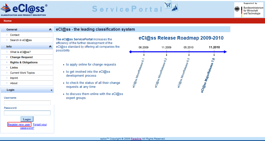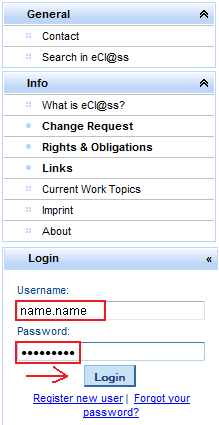 The user must enter the set username and the password received via e-mail in the confirmation message. The user clicks [Login] and enters the ECLASS Service Portal.