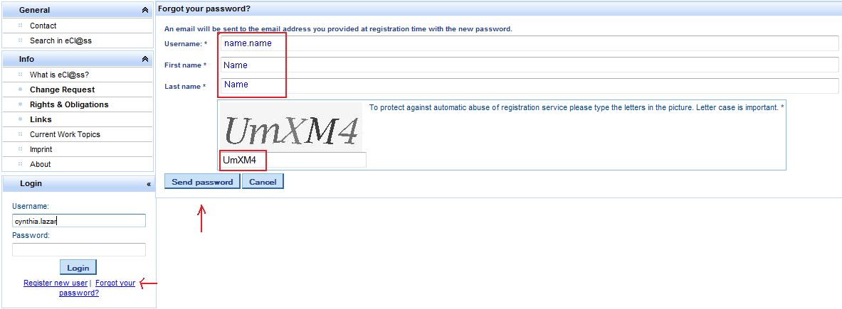 A forgotten password may be reset by requesting a new valid one to be sent via e-mail. Thus, the user clicks [Forgot your password?] and is directed to the password request form, which must be filled in with user name, first and last name, and the abuse prevention code.