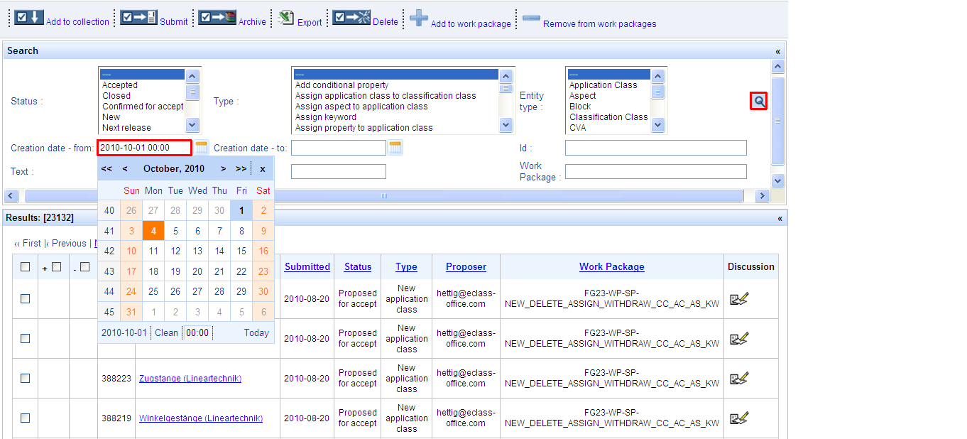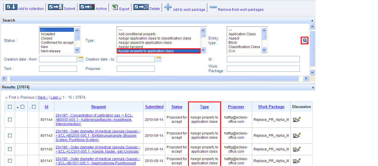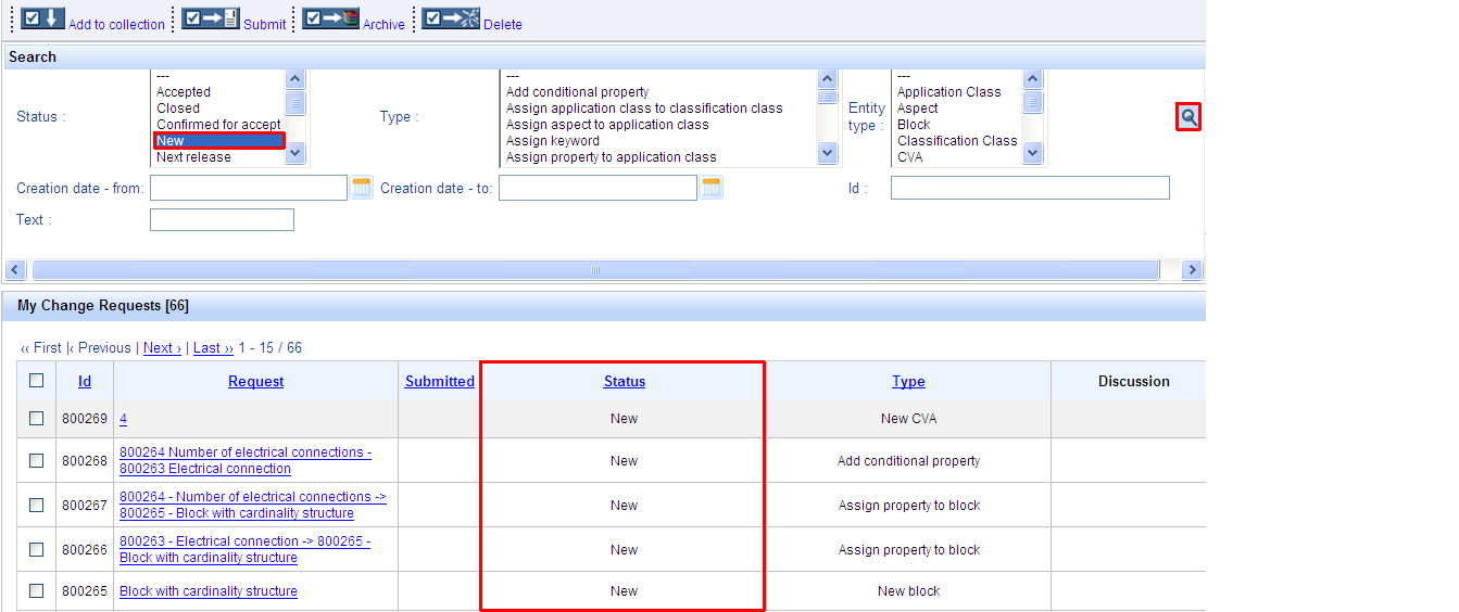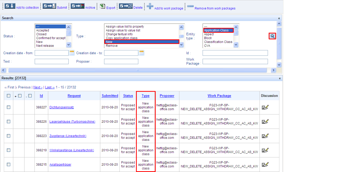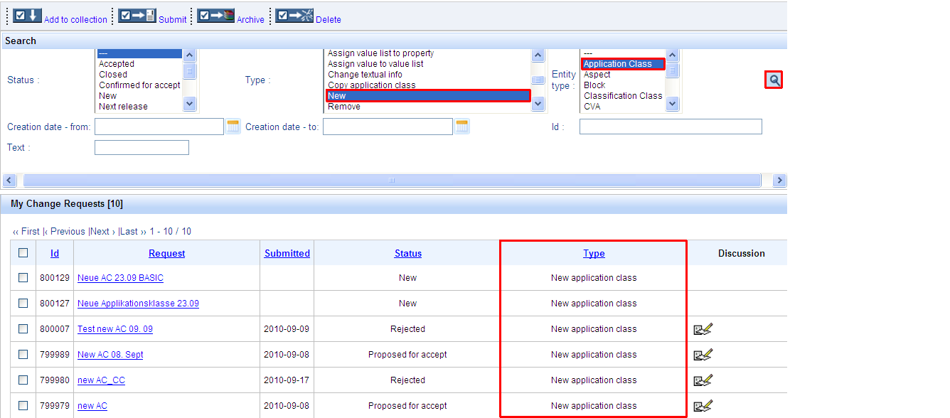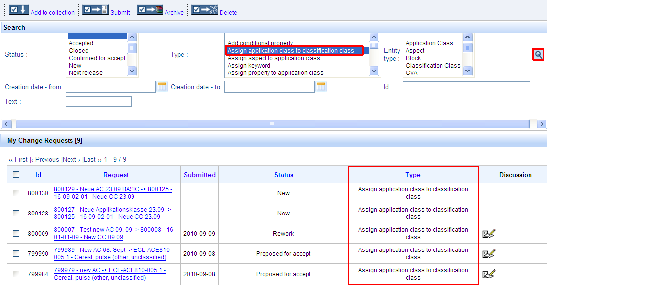 When searching after Change Requests of type NEW, REMOVE and CHANGE TEXTUAL INFORMATION, the user can refine the search by selecting in addition the entity type => if selecting the type NEW in combination with the entity type APPLICATION CLASS, the system will render as results only CRs for new ACs: