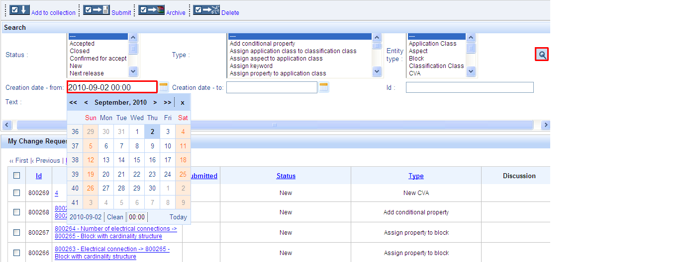 The user can enter the CR creation date or select it from the calendar. CRs created over a certain period of time can be searched for by entering or selecting the start and end date from the calendar. The system will render as results the CRs created on the selected date/within the selected interval: