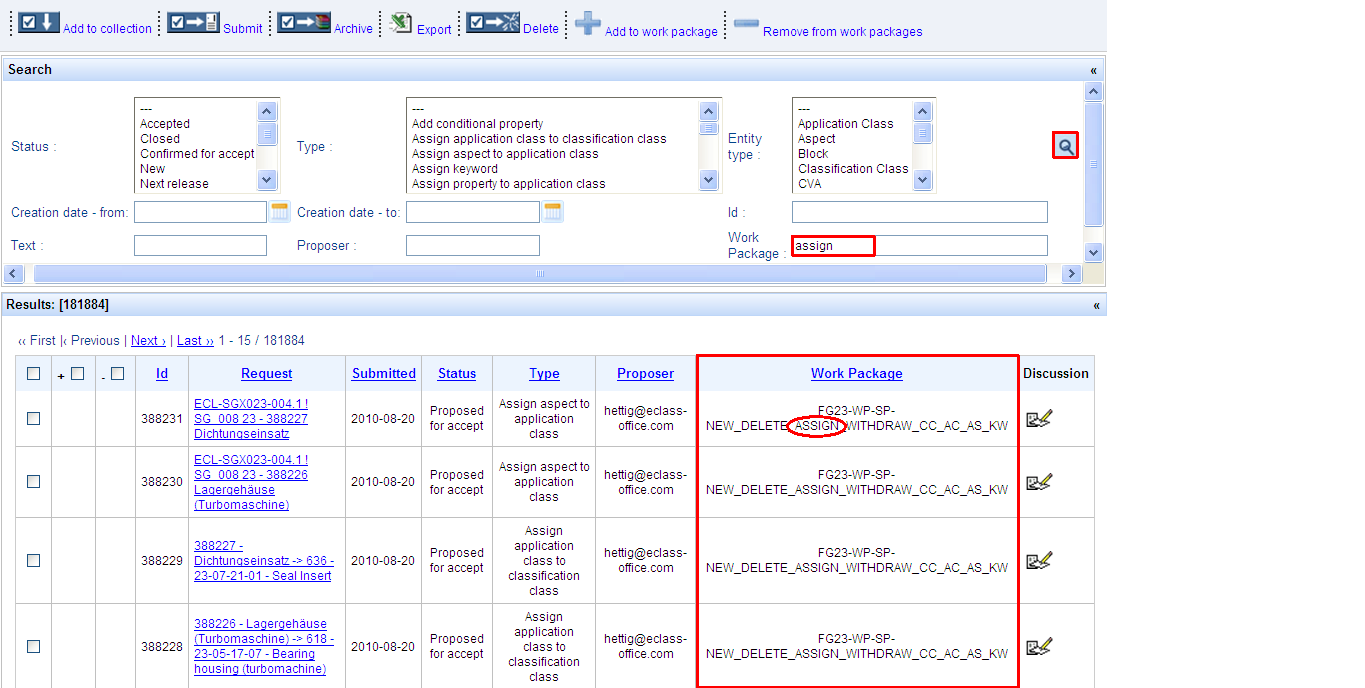 For this, the user enters the the name or description (or parts of them) of a WP in the WORK PACKAGE-field and and presses the Search-symbol. The system will display only the CRs contained in the specified work package: