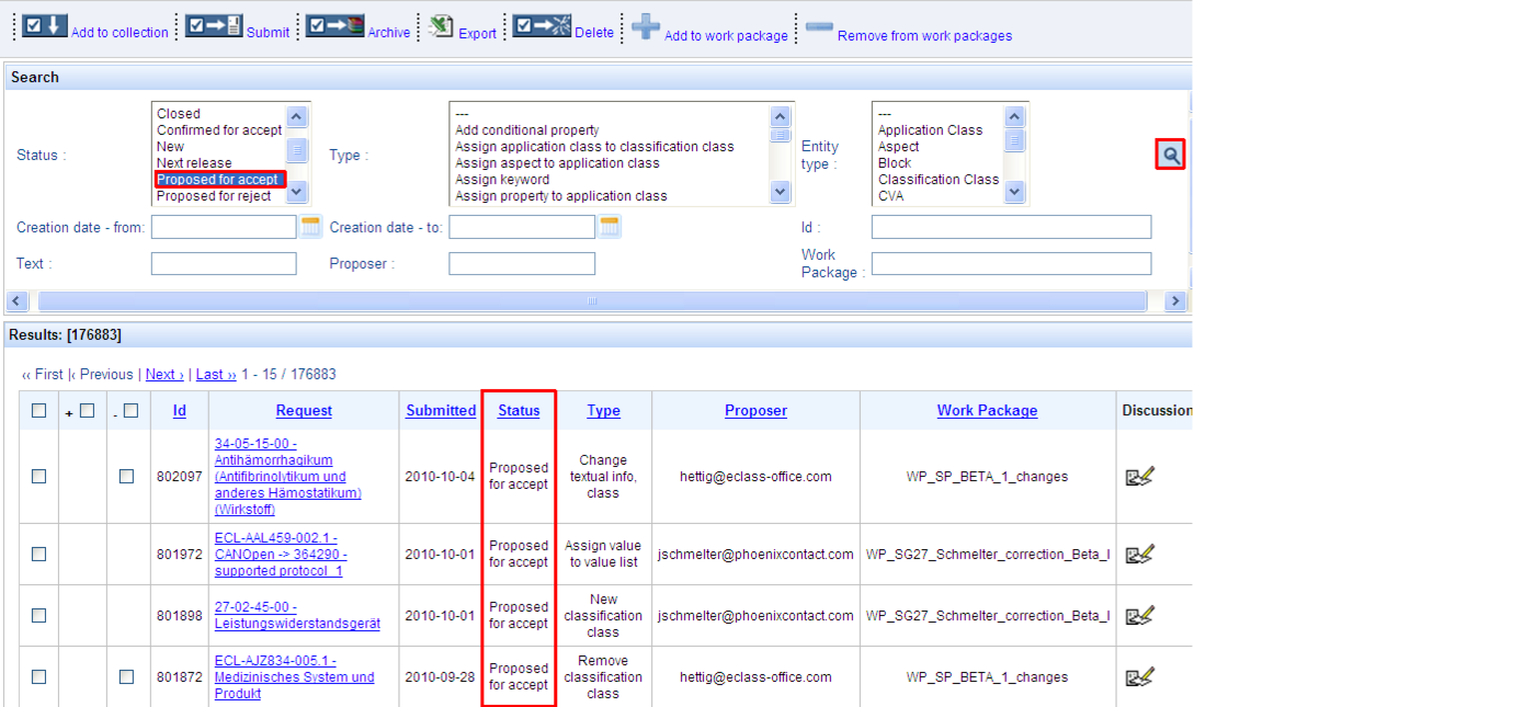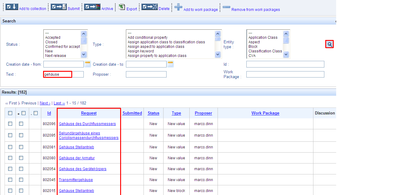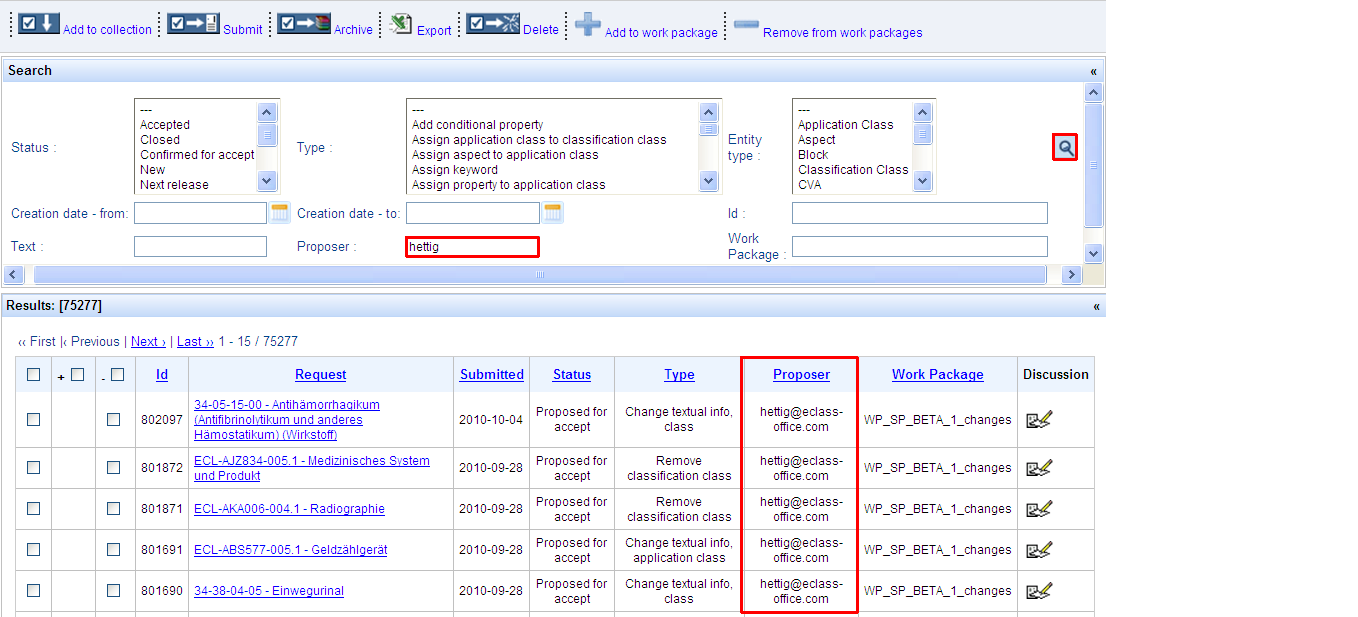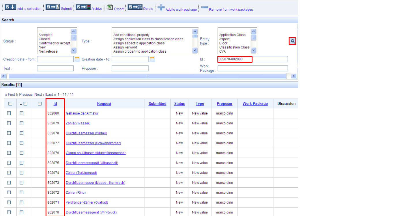 For this, the user enters the proposer in the PROPOSER-field and and presses the Search-symbol. The system will display only the CRs created by the specified proposer: