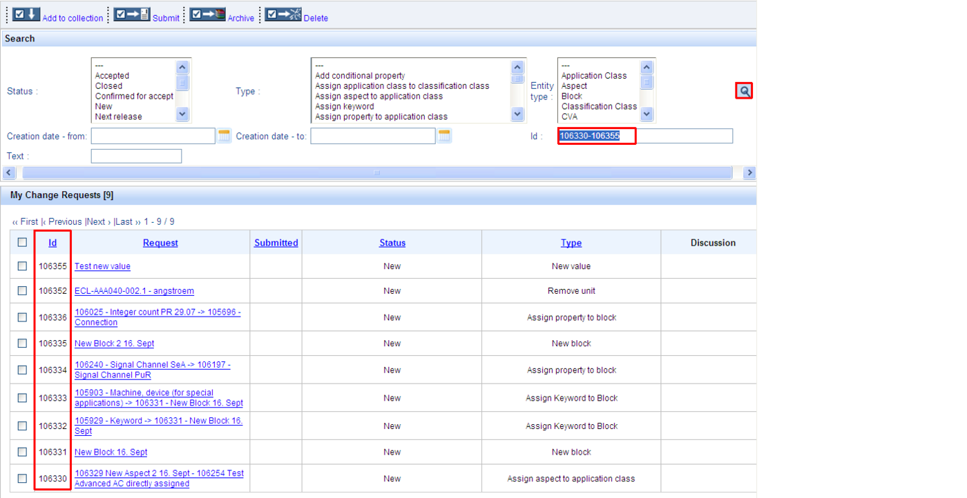 For this, the user enters one ID, several IDs separated by comma (e.g. 106356, 106359, 106355) or a range of IDs (e.g. 106330-106355) in the ID-field and presses the Search-symbol. The system will display only the CRs having the specified ID/IDs: