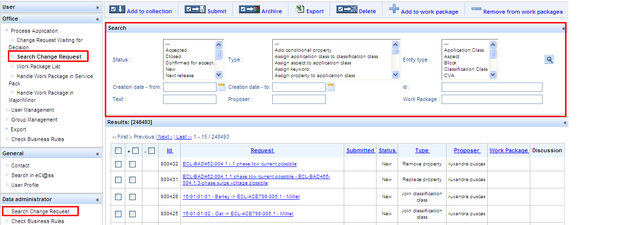 The Search Change Request mask can be retrieved by accessing one of the menu entries User/My Change Request, Office/Search Change Request or "Data Administrator/Search Change Request".