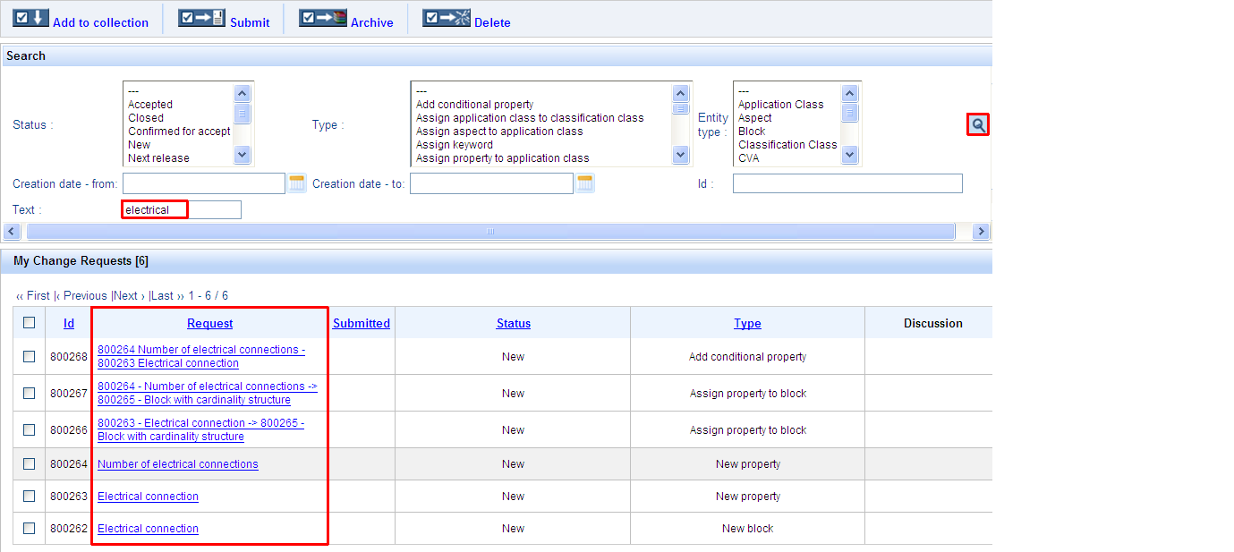 The Add to collection button enables users to add selected change requests (check box in front of them checked) to a collection of change requests, in order to perform operations such as Submit, Delete or Archive for several CRs at a time.