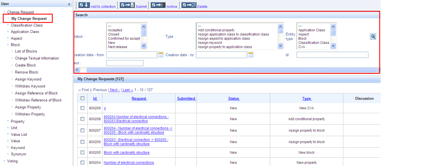 The Submit button enables users to submit their change requests (status NEW) in order to be accepted.