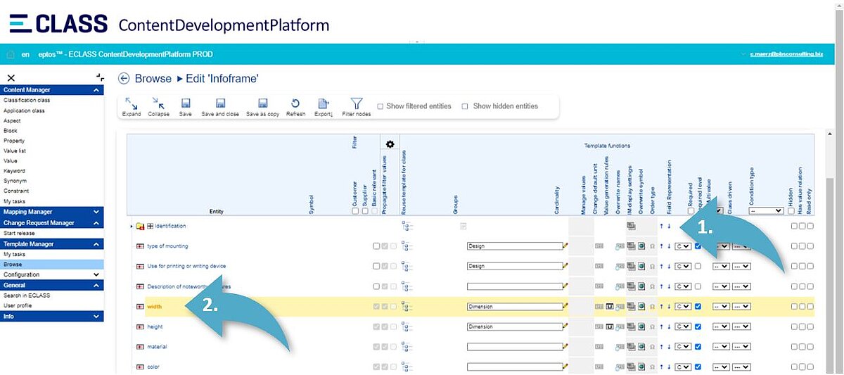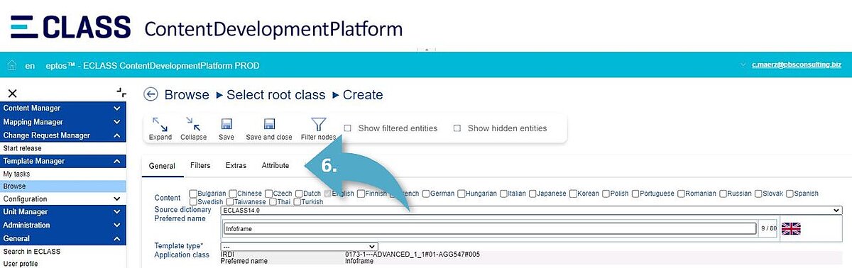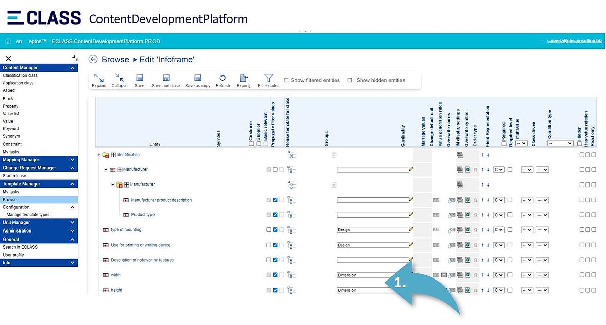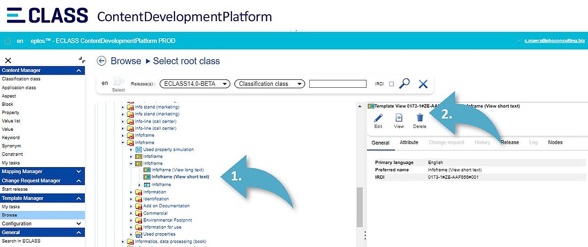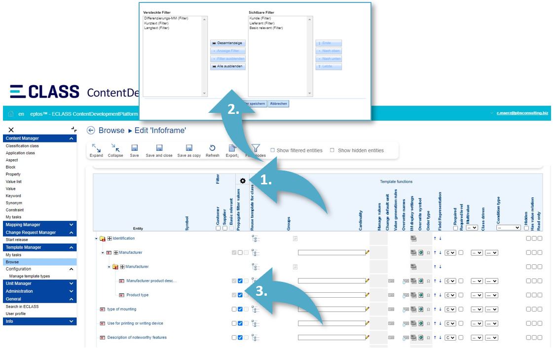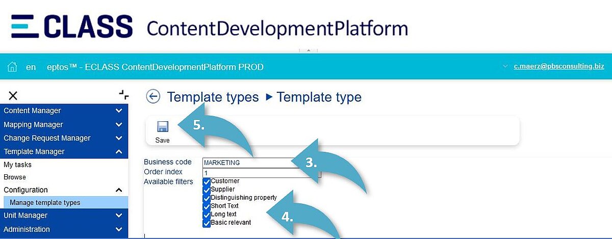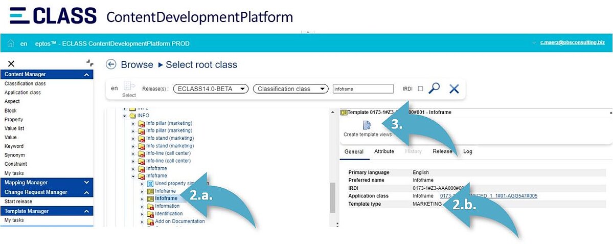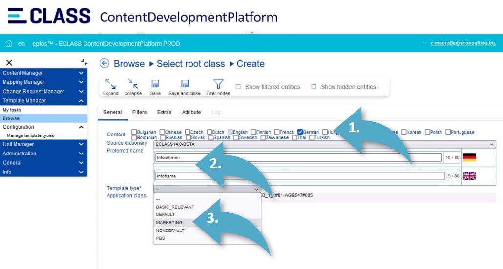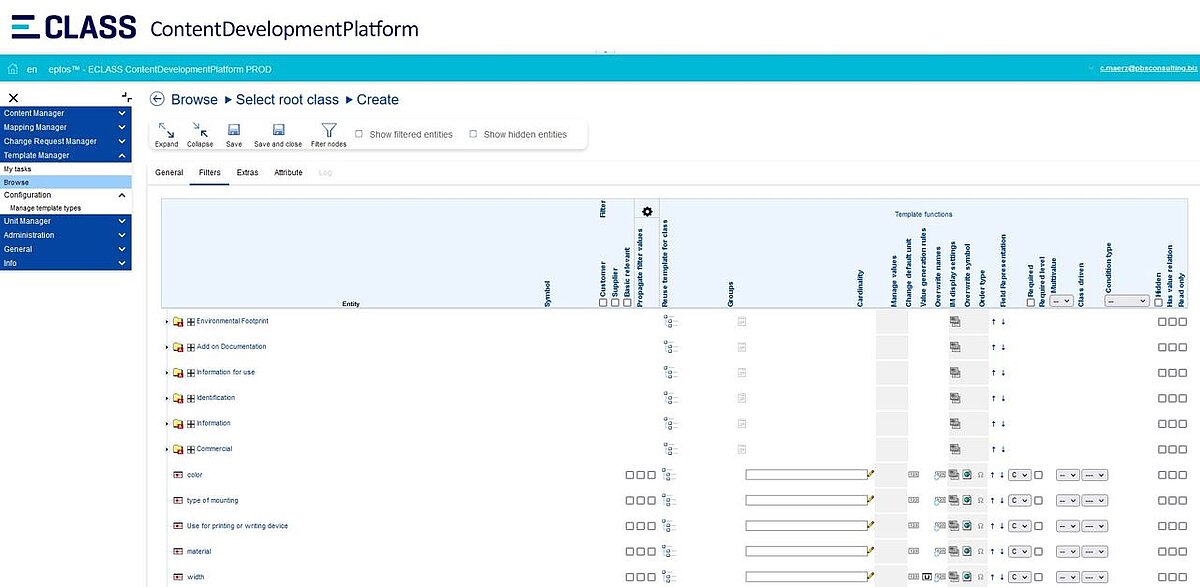 This manual is a working guide for the creation of ECLASS templates by using the platform ECLASS CDP (ContentDevelopmentPlatform). The possibilities for using templates are very diverse. Therefore it is not possible to describe all functionalities in the context of the possible use. Using the example of the „Marketing“ template, the manual describes how a user can create a new template in CDP. In addition, the steps for defining filters and views are described, which are essential components of ECLASS templates.