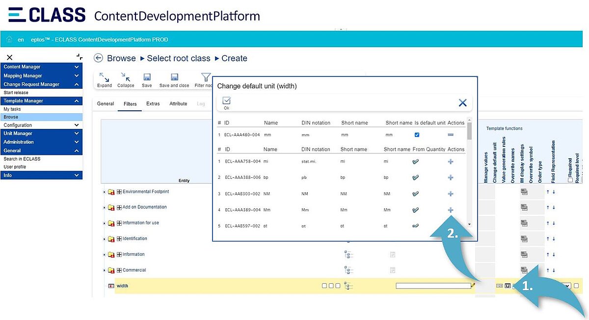 2. In the window „Change default unit“ you can add an additional unit of the ECLASS Dictionary.