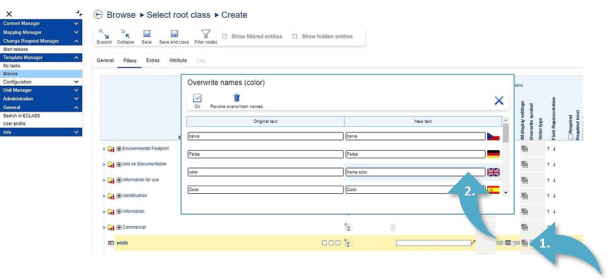 4. „Available filters“: If you want to use one of the filters in your template, you have to select these filters in this menu. Filters are exported as an additional flag for an ECLASS Property (PR).