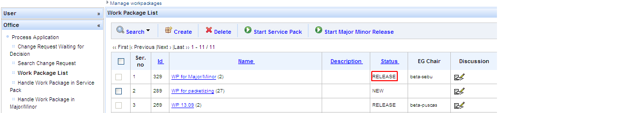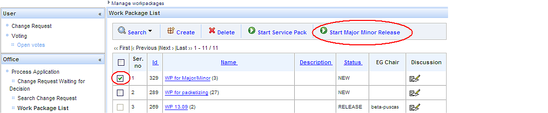 Step 1: [Office - Process Application – Work Package List] Office checks the box in front of WP and clicks button “Start Major Minor Release”.
