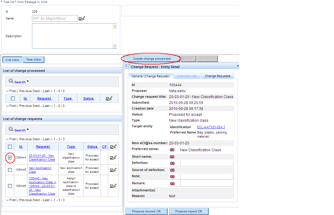 b) The system does not allow the creation of 2 different CPs for one and the same CR. In this case, after having selected a CR and pressed button “Create Change Processed”, following message is displayed: “Change Processed X was already created for Change Request Y.”