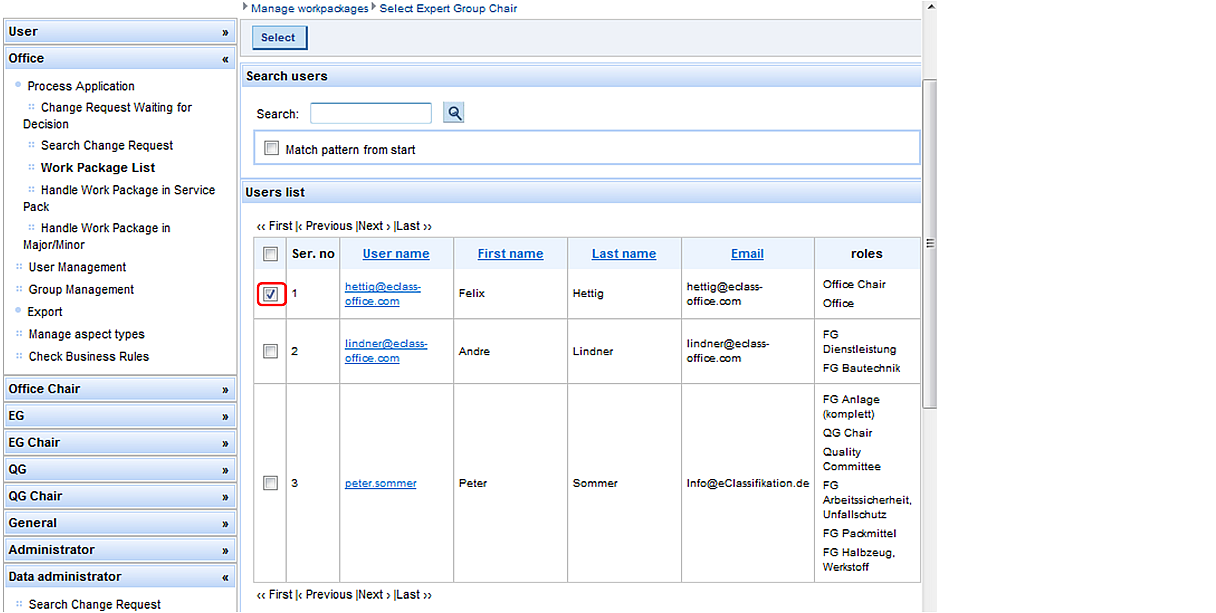 Step 2: Office selects a user assigned to Expert Group Chair.
