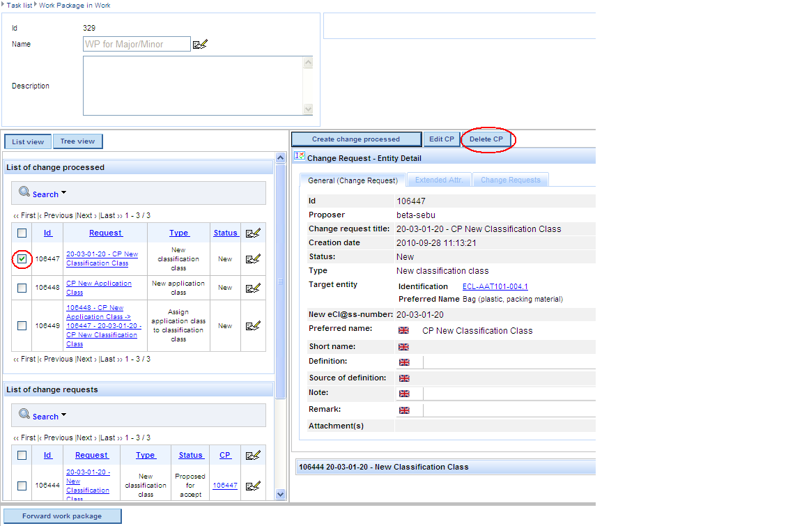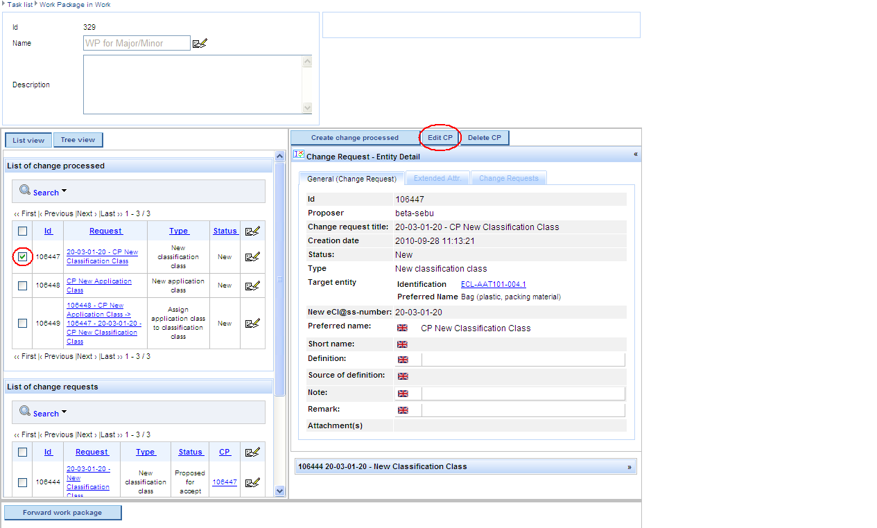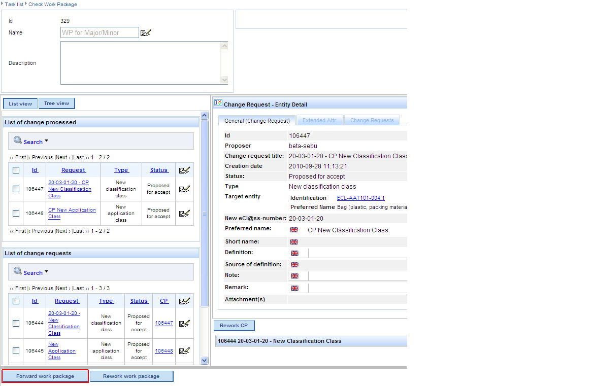 The workflow may be continued by pressing button [Forward work packege] ONLY AFTER all CRs have been connected to CPs or if they have been set to status “Proposed for rework” or “Proposed for reject”. The WP is sent to EG Chair and disappears from the task list of EG.