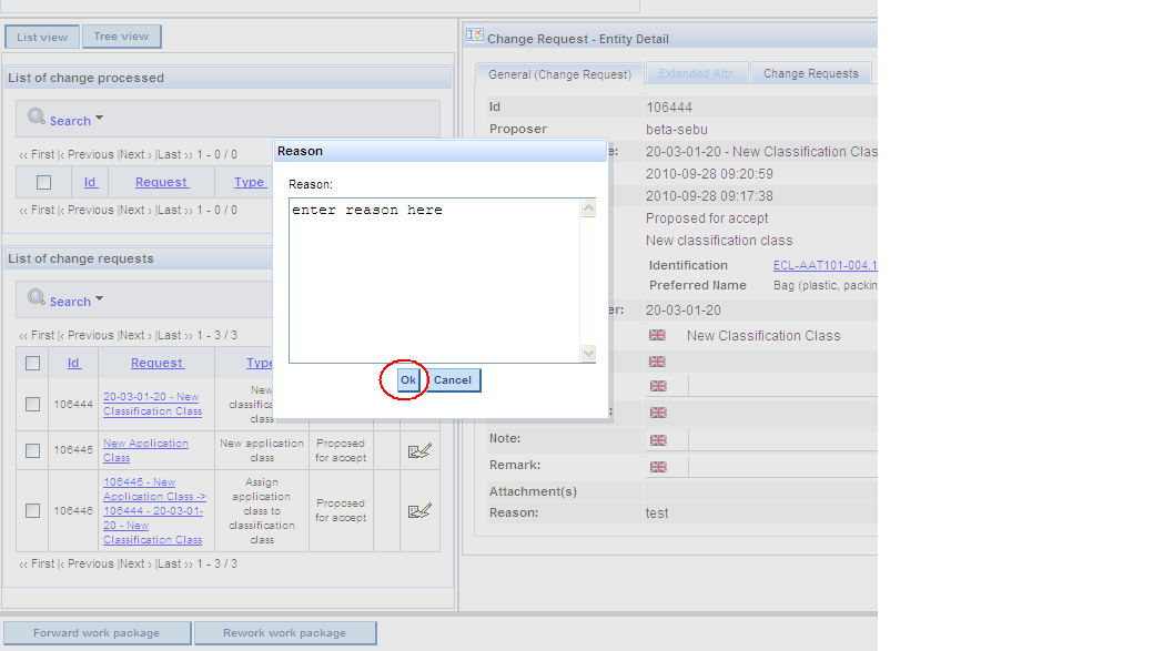 Step 3: Give the reason for proposing the CR for rework and press OK-button.